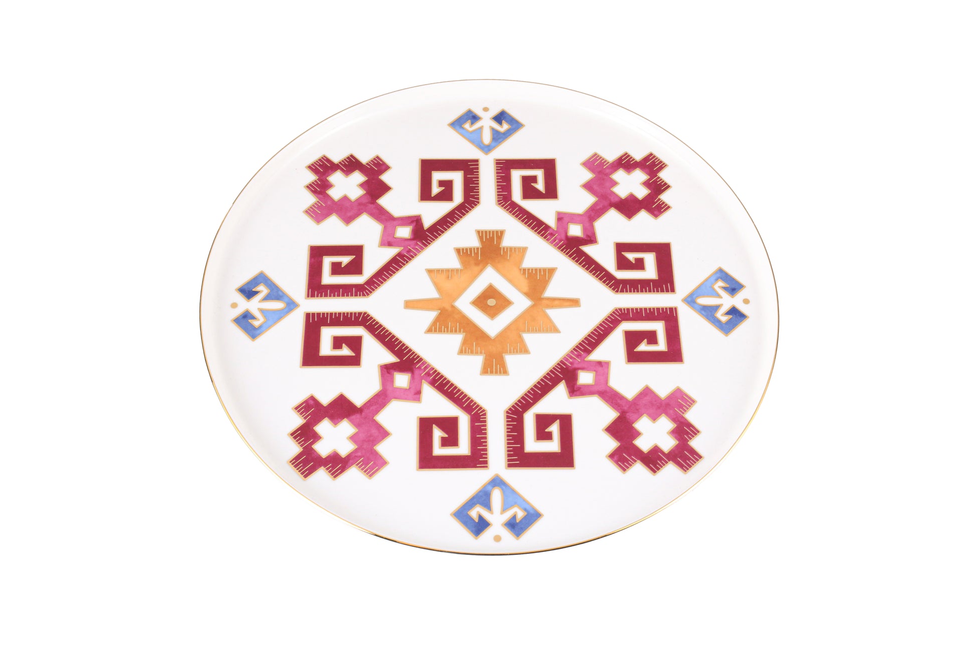 This exquisite large flat plate from the 'Arabesque' collection brings a timeless touch of artistry to your table. Its intricate and vibrant geometric patterns, framed by a refined gold rim, make it a true centerpiece. This piece is perfect for making a bold and elegant statement at any dining occasion.