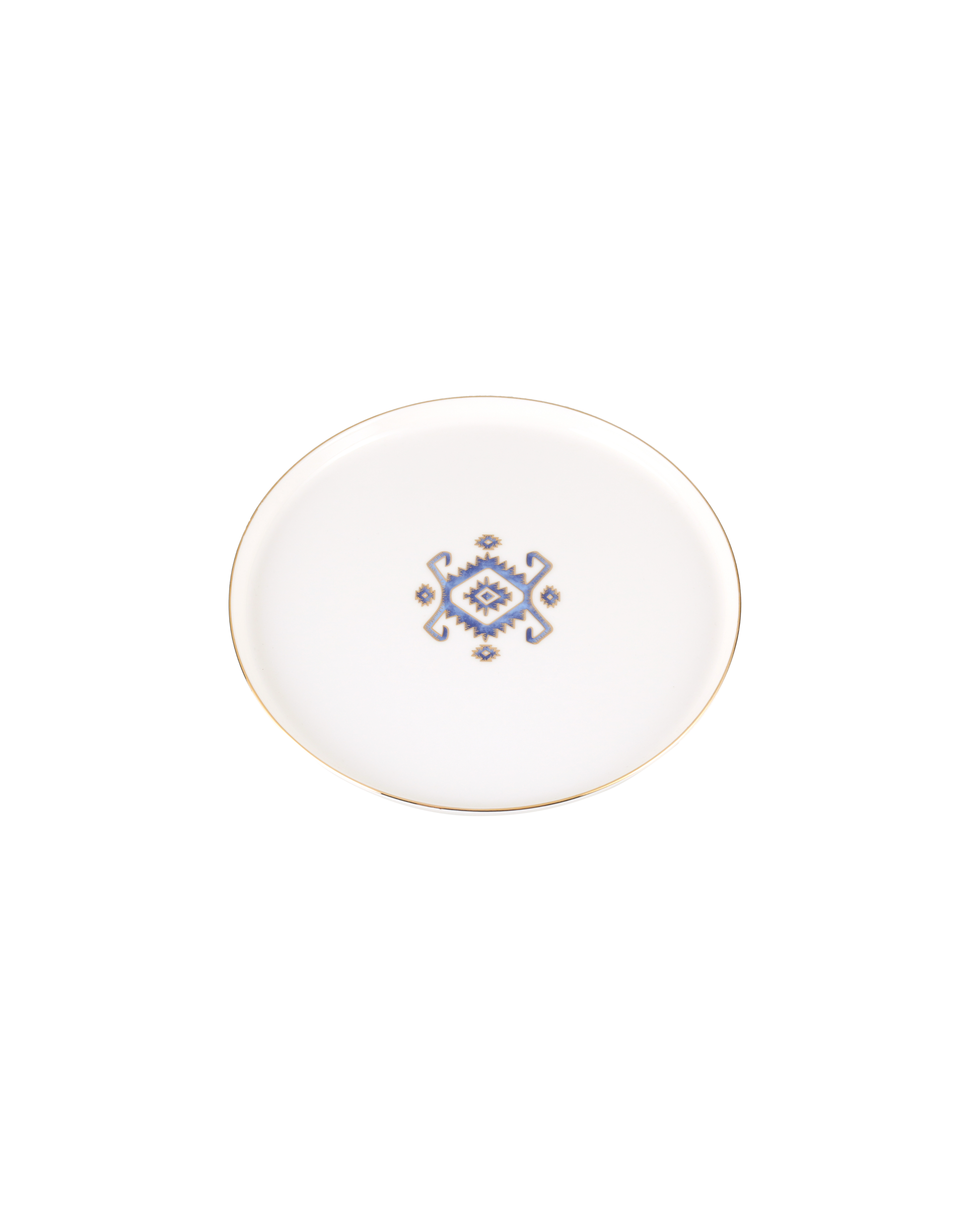 This exquisite porcelain flat plate brings a timeless touch of artistry to your table. It features a distinct geometric 'Arabesque' pattern in a striking blue, complemented by a refined gold rim.