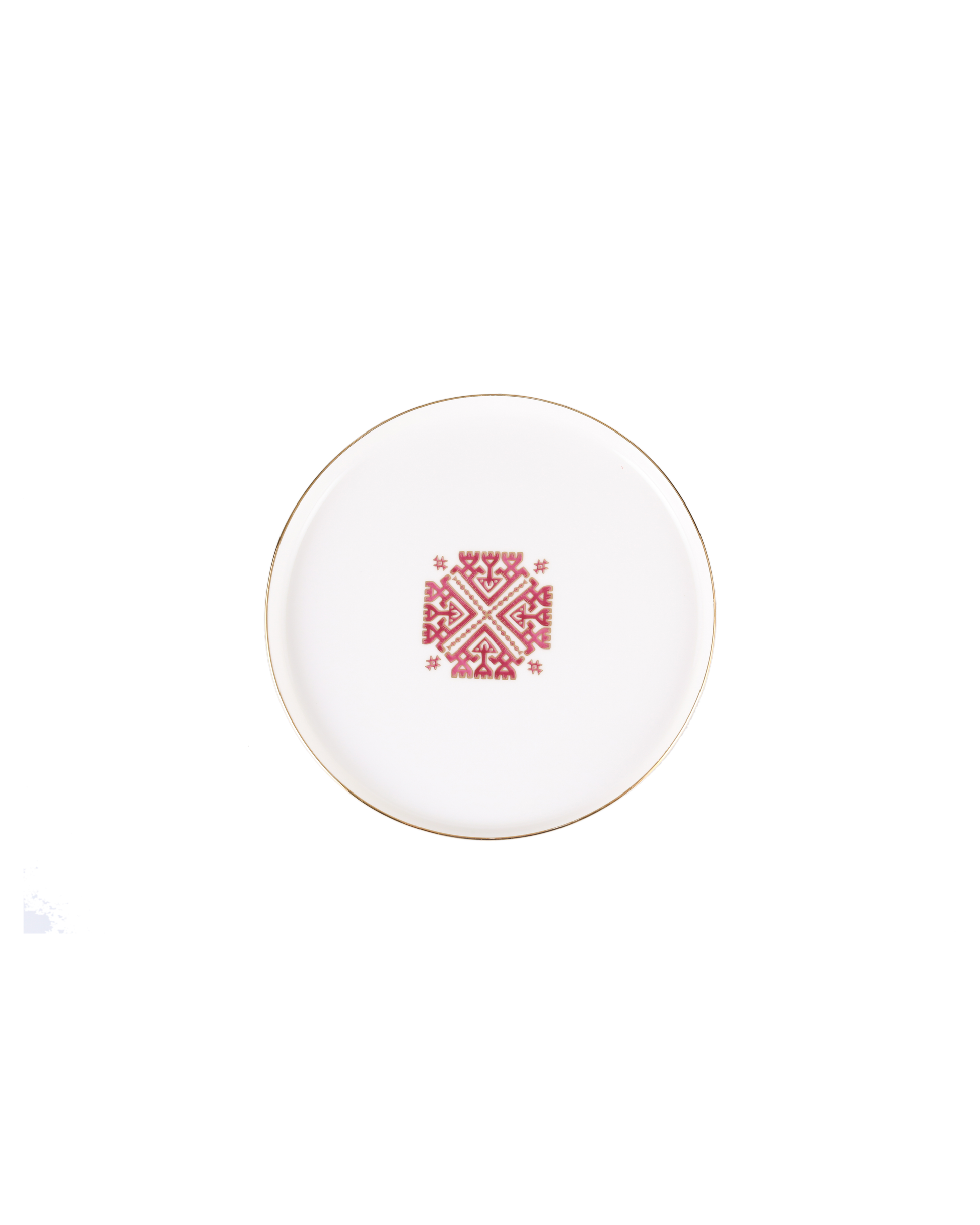 This exquisite porcelain flat plate brings a timeless touch of artistry to your table. It features a distinct geometric 'Arabesque' pattern in a vibrant red, complemented by a refined gold rim.