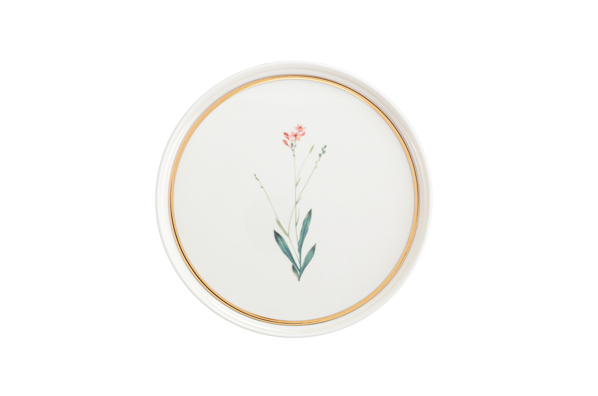 Bring the serene beauty of a botanical garden to your table with this exquisite flat plate from the 'Botanical' collection. Featuring a meticulously detailed pink wildflower illustration, this piece is rimmed with a delicate gold band, elevating its natural elegance.