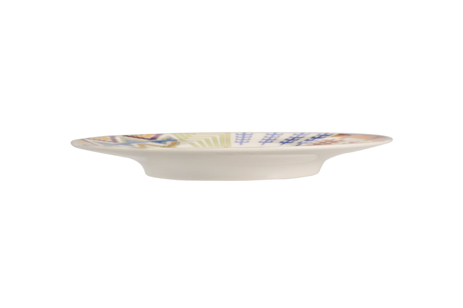This stunning porcelain flat plate from the 'Ruanda' collection brings a kaleidoscope of vibrancy to your table. It features an intricate, centralized sunburst pattern surrounded by bold geometric borders in brilliant colors, all framed by a refined gold rim.
