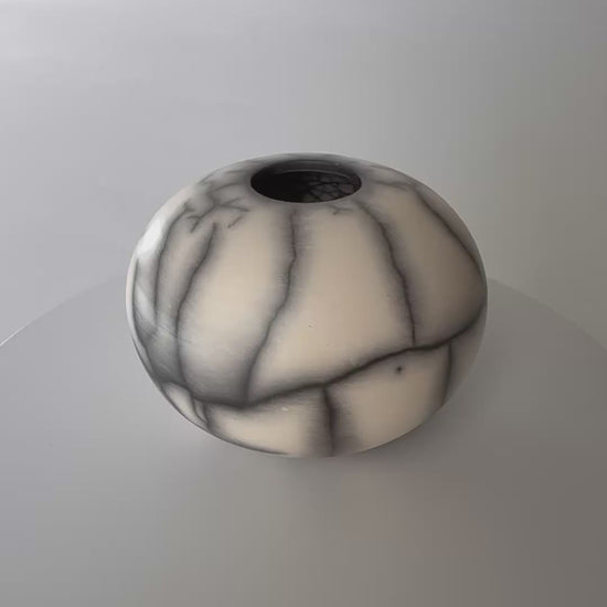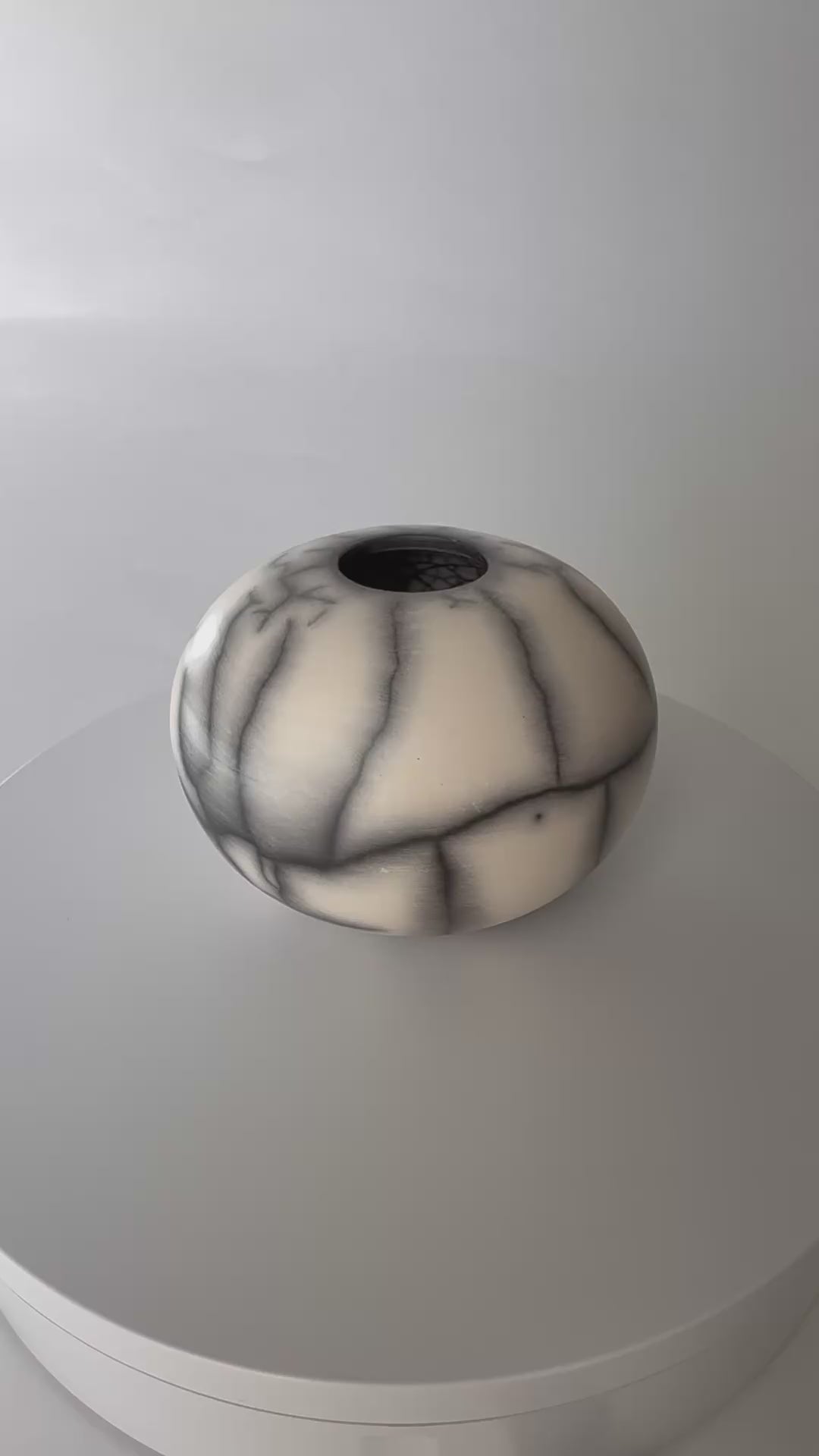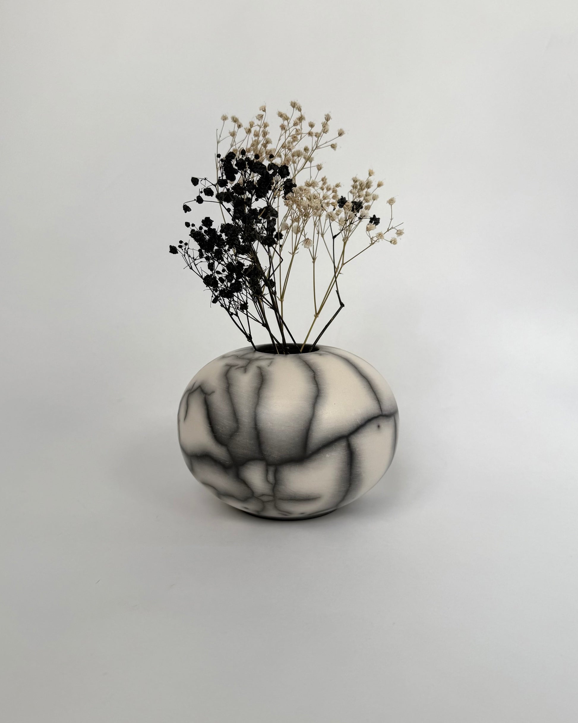 A true masterpiece, this sculptural vase is a one-of-a-kind work of art. It is handcrafted using the dramatic, unpredictable Raku firing technique. The entire beauty of this piece comes from the raw, "naked" smoke finish, where smoky, web-like lines and crackle patterns are permanently captured on the ceramic surface. This process ensures no two pieces in the world are ever alike.