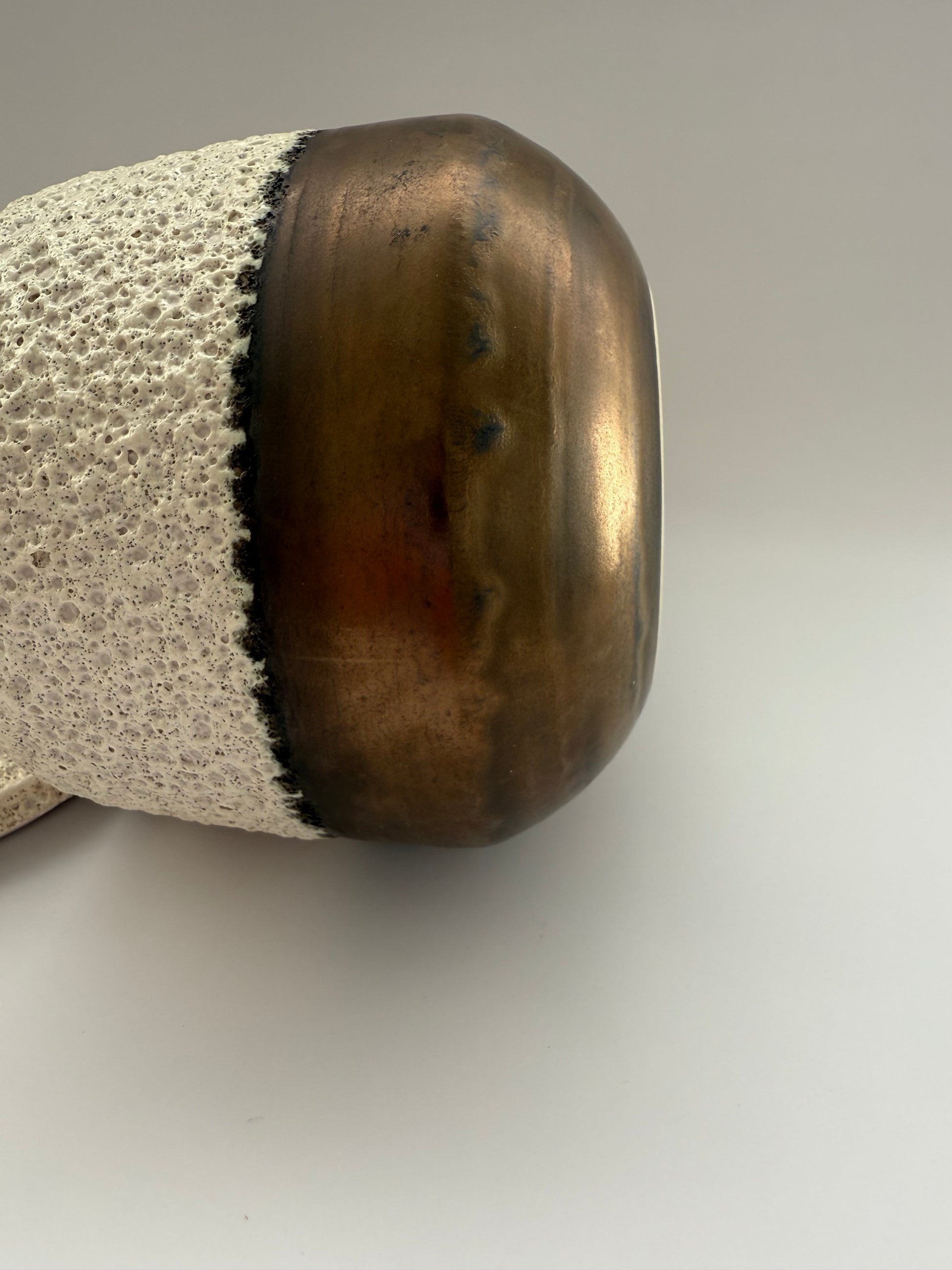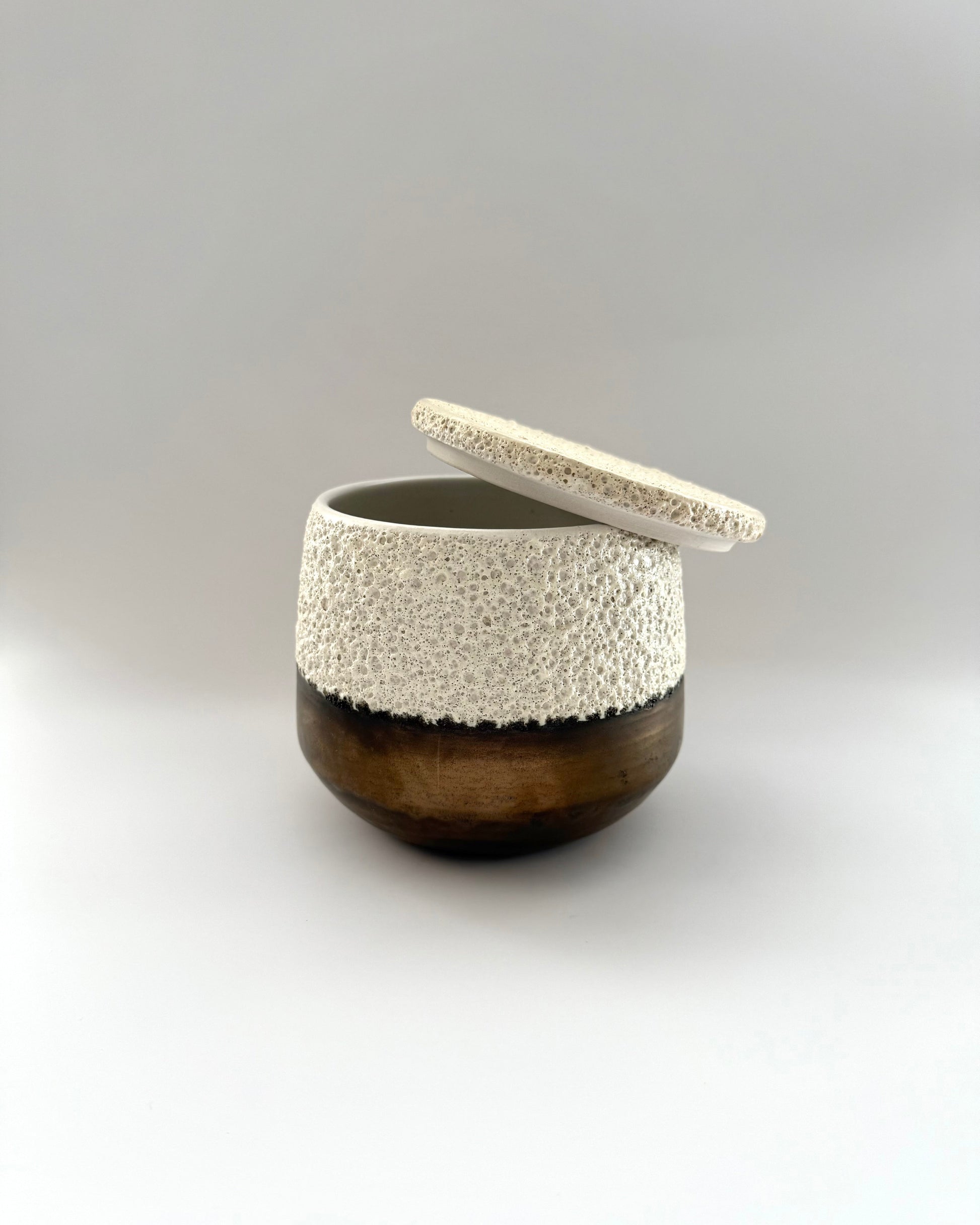 A true statement of natural, tactile craft, this jar is a highlight of our handcrafted collection. Made by artisans, it features a stunning, dual-texture glaze: the top is a highly textured, volcanic white, while the bottom is a smooth, metallic bronze. This lidded jar is a substantial piece of functional art, perfect for adding a "hero" moment to any shelf or surface.