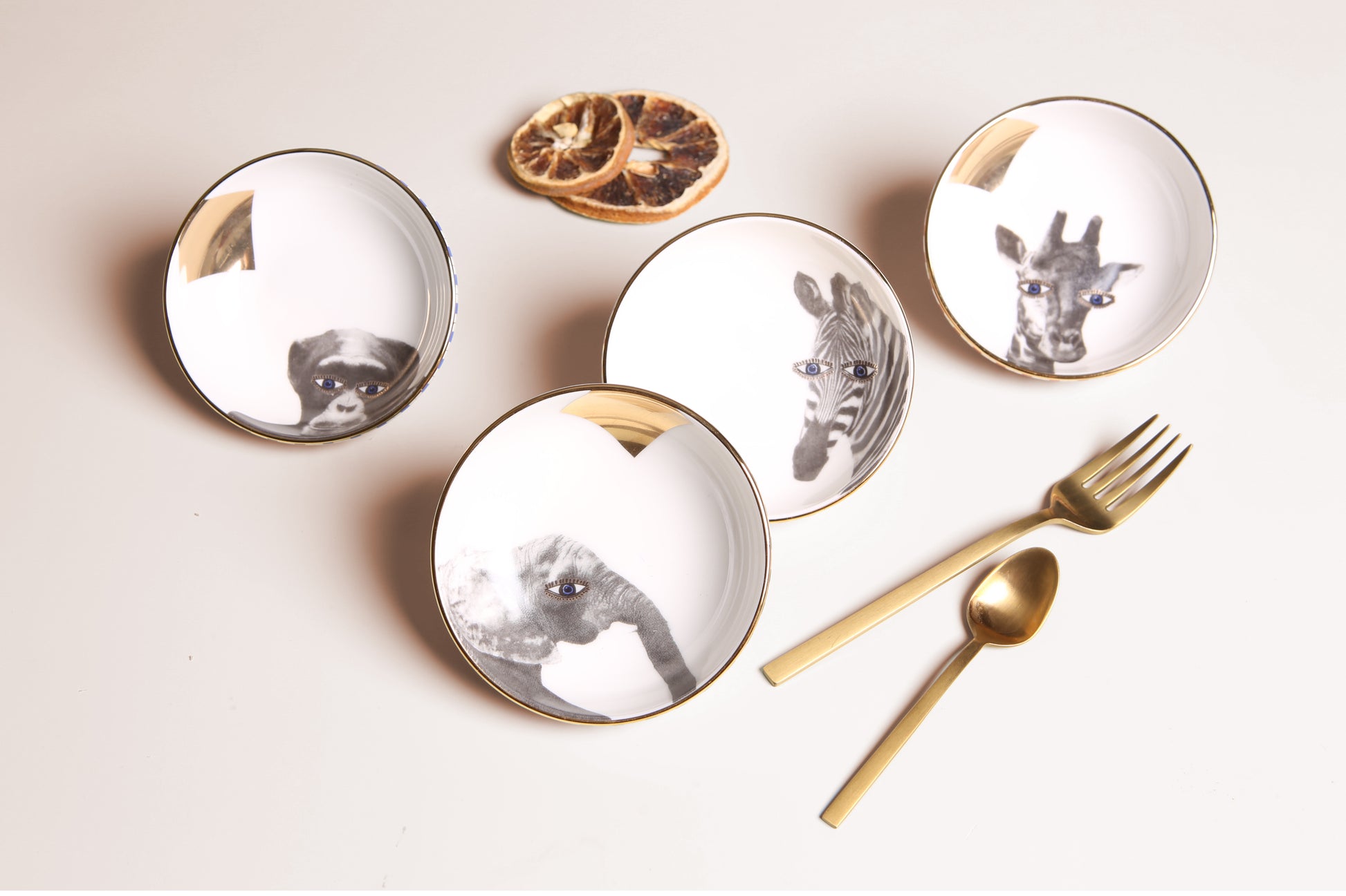 Adorn your dining table with majestic presence. This beautiful porcelain bowl features a compelling 'Wild Life Elephant' design, rendered in detailed monochrome with refined gold accents and piercing blue eyes.