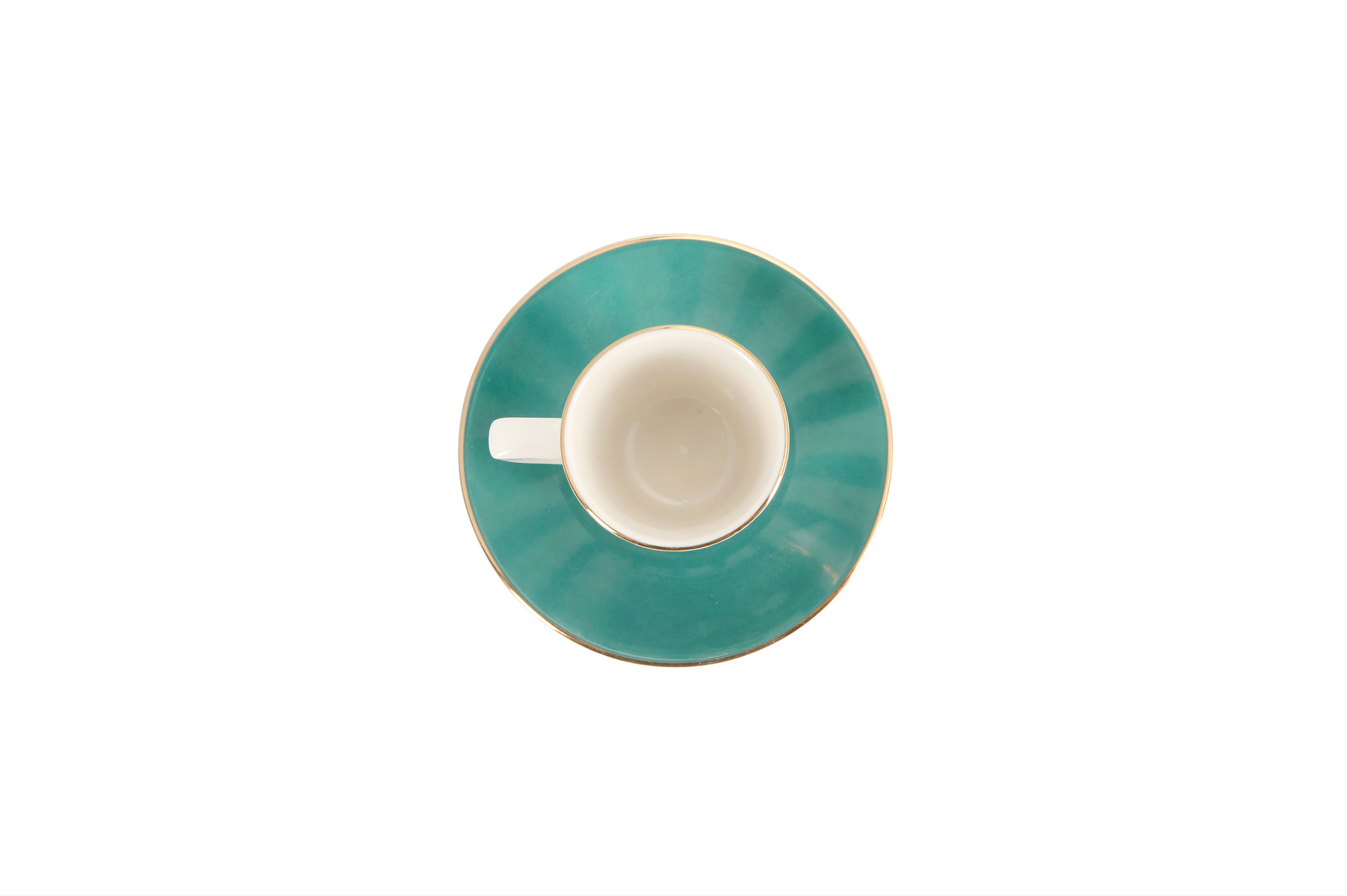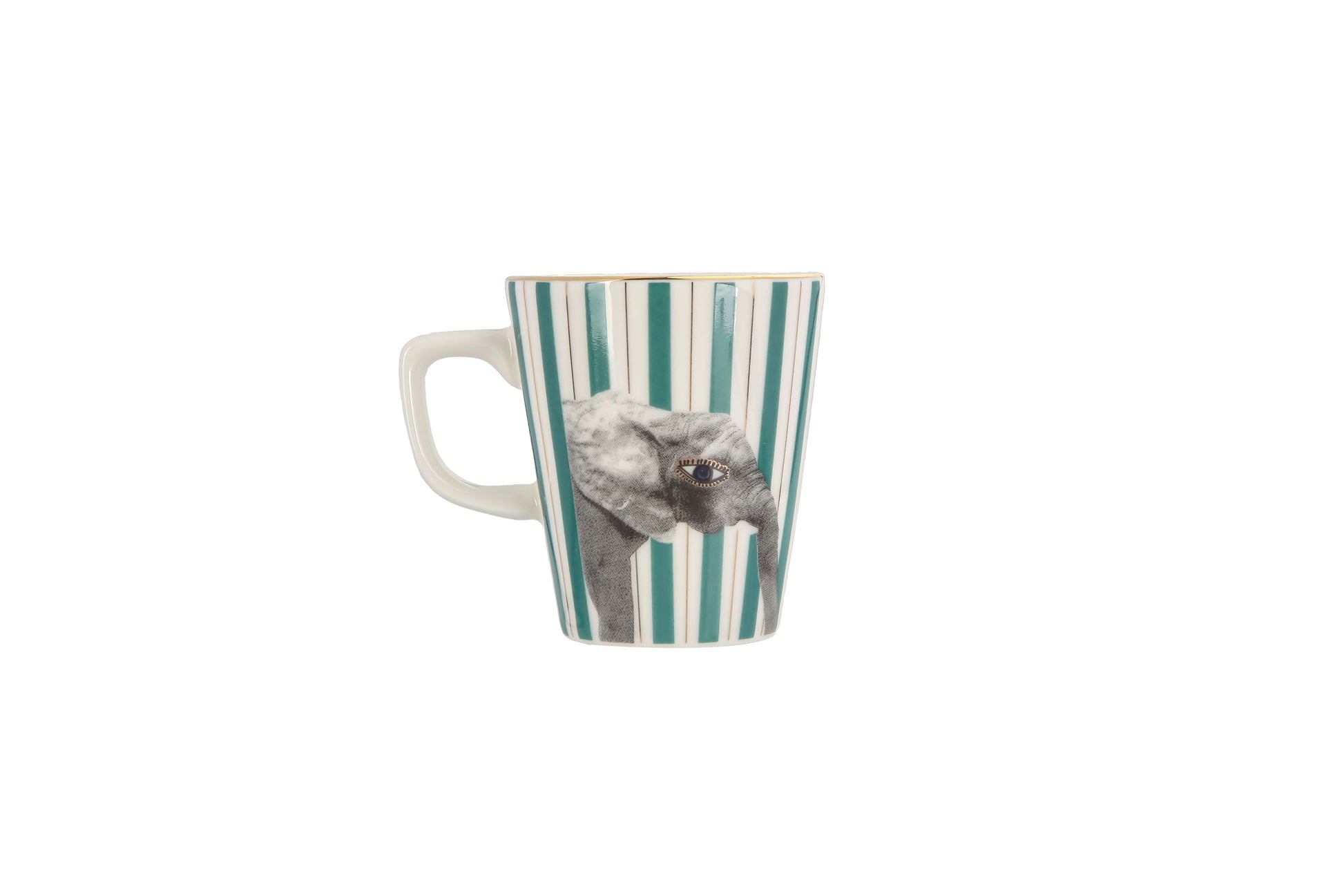 Adorn your kitchen with majestic presence. This beautiful porcelain coffee cup and saucer set features a compelling 'Wild Life Elephant' design on a charming teal and white striped backdrop. An impressive addition to your daily routine.