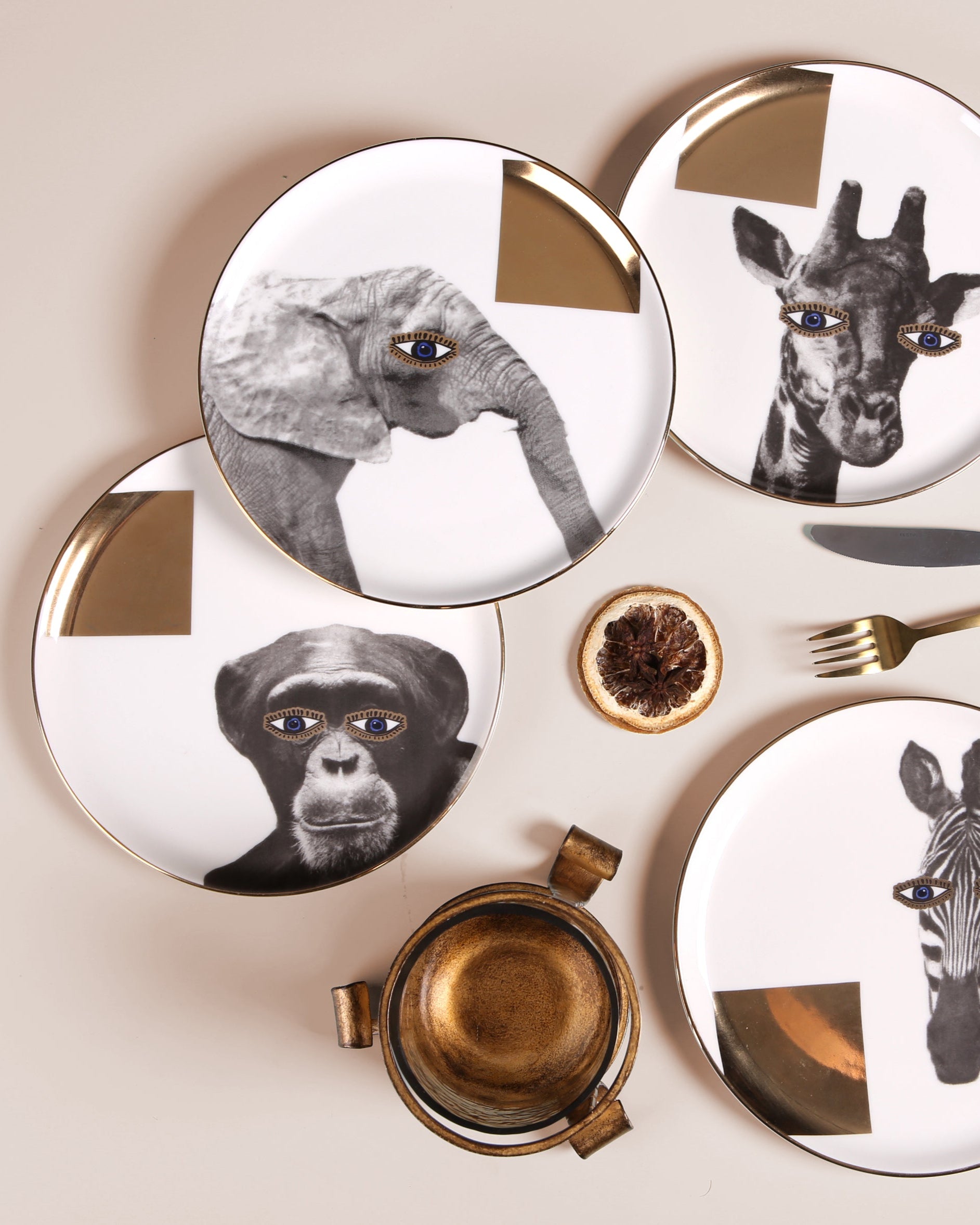 Infuse your table with captivating charm. This unique porcelain flat plate features an artful 'Wild Life Monkey' design, beautifully blending monochrome detail with a touch of playful gold and sparkling blue eyes. A statement piece for any dining occasion.